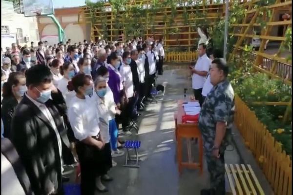 在巍然屹立的中国人民解放军进军和田纪念碑前,来自阿依玛克村和巴格齐村的全体党员干部和驻村工作队员,面向鲜红的党旗,全体列队肃立,高举右手,重温入党誓词,再一次庄严做出承诺,党员们以“信仰不移、忠诚不变”的坚定信心,向党的生日献礼,短短十二句话、80个字,句句千钧,深切表达恪守誓言的信念,更加坚定了打赢脱贫攻坚战的决心。