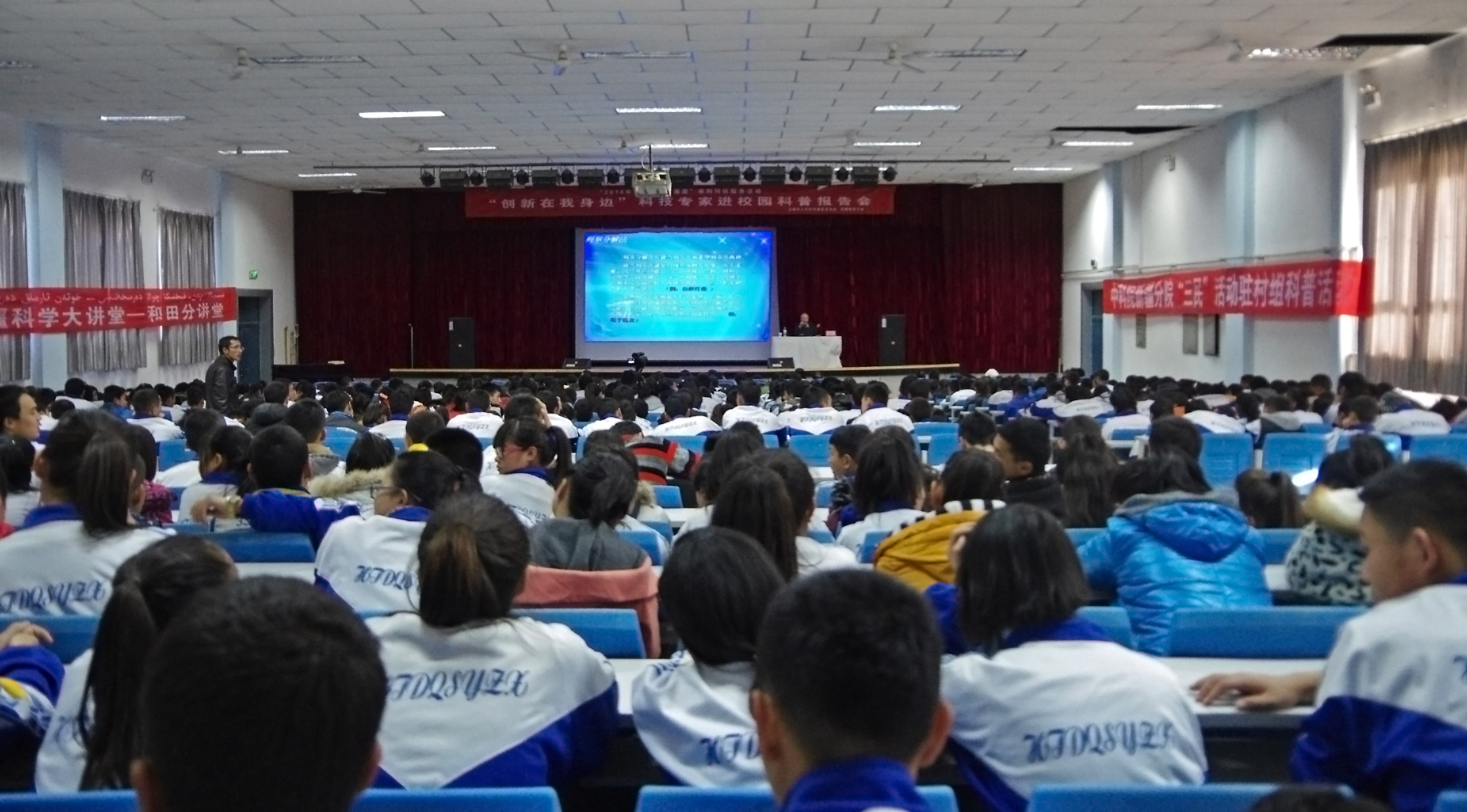 中科院新疆分院“三民”活动住村组于11月28日在和田地区实验中学举办了“创新在我身边”科技专家进校园专场科普报告会。和田市部分科技辅导员教师及该中学部分高中学生约700人到会听取了讲座。报告会上,新疆物理学会新疆核学会秘书长、中科院新疆理化所高级工程师欧芒作为报告主讲人,就如何培养、激发青少年的科技创新意识、思维与方法,结合历年青少年科技创新赛作品点评,以通俗易懂、言简意明、流畅的语言进行了深入浅出的分析和讲解。报告内容丰富,特色鲜明精彩,受到到场师生的欢迎。报告会后,分别就现场师生的提问进行了面对面的交流。