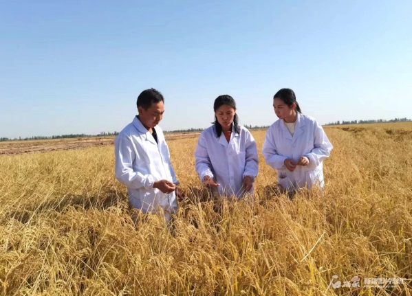 新疆农科院核技术生物技术研究所水稻创新团队张燕红研究员(中)与团队成员一起观察水稻新品种长势。(来源:新疆农科院提供)