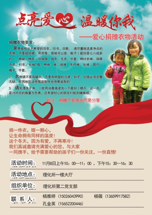 第二党支部在此次活动前一周开始宣传和动员,并于活动当天派专门人员进行衣物的收集和整理。活动得到了所领导、职能处室以及各学科的支持。不断有职工提着清洗干净、整理好的衣物来到会场进行捐赠。
