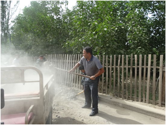 阿依玛克村包户干部在走访中,得知有些家庭家中没有劳动力,施工留在门前的四堆垃圾没法清理。中科院驻阿依玛克村工作队和村两委得知情况后,于当天下午组织志愿者服务队15人前往1组4号家帮助干活。劳动中,大家不怕脏、不怕累,拿起铁锹,干得热火朝天。阿依玛克村第一书记、工作队队长吴卫华,党支部书记艾力带头参加义务劳动。村民看到后,有的开上自家的三轮电瓶车参与其中,有的买了矿泉水和饮料送到志愿者手中。在大家共同努力下,仅用1小时就将所有垃圾全部清理干净。