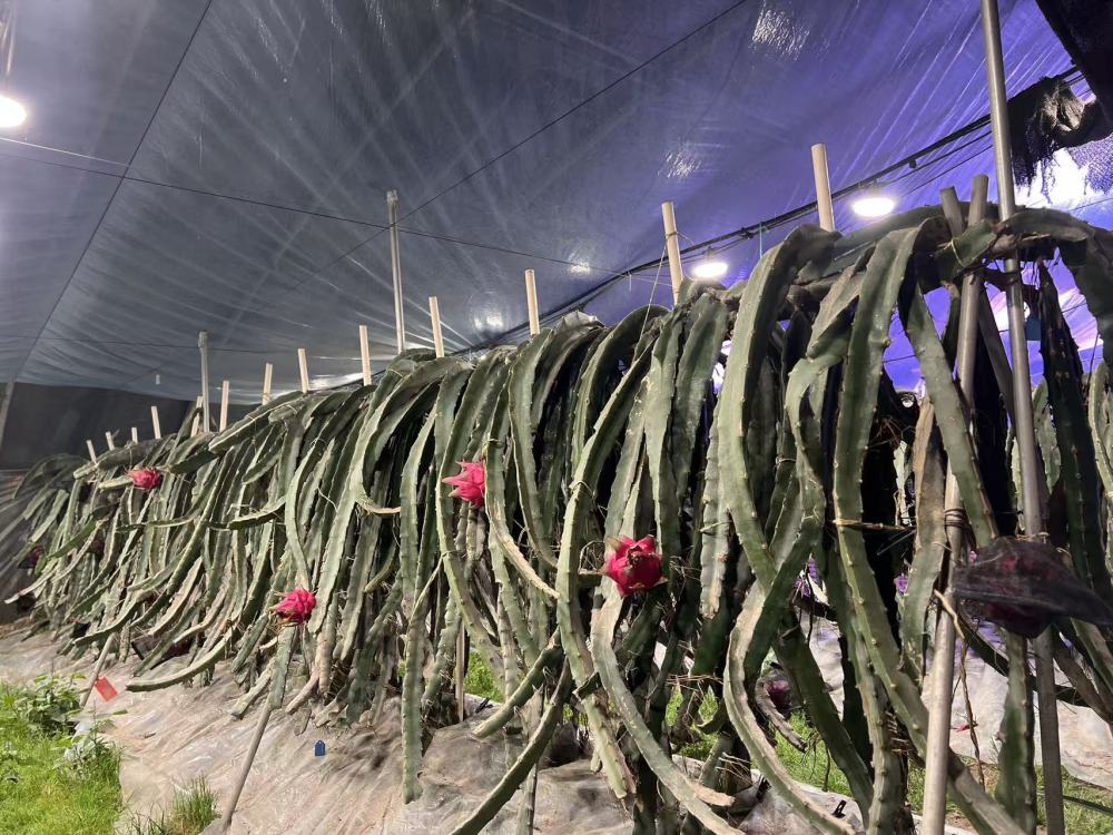 2025年12月29日,墨玉县阿依玛克村大棚里即将成熟的火龙果。新华社发