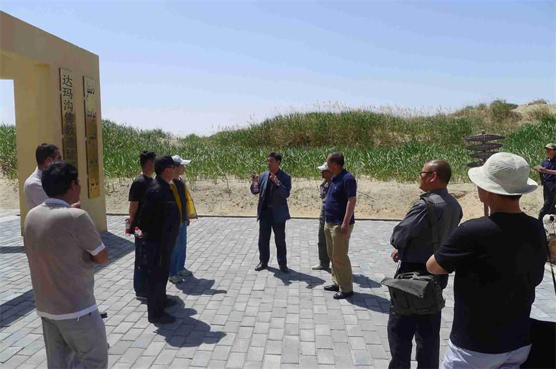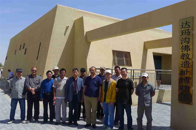 全体成员经一个半小时的行程,来到了位于策勒县达玛沟镇达玛沟古佛教遗址群。据讲解员讲解,这里分布着托普鲁克墩、哈德里克、克科吉格代、巴勒瓦斯提、老达玛沟、乌尊塔提、咖拉心、丹丹乌里克等著名的佛教遗址。在这些遗址群中,保存较为完整的达玛沟小佛寺极为珍贵。小佛寺形状呈正方形,面积4平方米,残高1.5米,寺内佛像雕塑保存完好,遗址四面残壁仍然保留有大量色彩鲜艳的大乘佛教壁画。