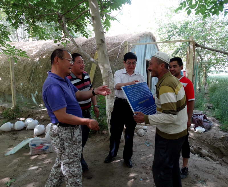 董云社还对住村工作组正在开展的“林下养鸡综合技术示范与推广”项目、林下养鹅、水稻田养蟹、规模化养兔等“惠民生”项目进行了实地考察调研,并为阿依玛克村“林下养鸡”示范户授牌,鼓励养殖户学习先进的科学养殖技术,通过自己的劳动致富,同时发挥好示范作用,为推动阿依玛克村经济发展做出应有的贡献。