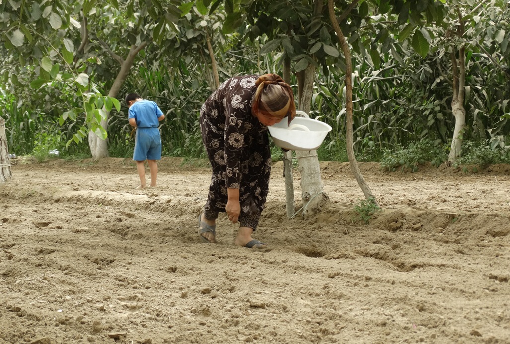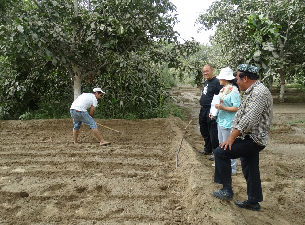 7月28日,烈日炎炎,酷暑难耐,在阿依玛克村一片核桃林下,住村工作组成员、新疆理化技术研究所资源化学学科科研人员和农民正在热火朝天地忙着种植维药,虽然汗水早已流满脸颊,浸湿衣背,但每个人都面带笑容,热情如骄阳一样火热。农民用自制的播种工具精确控制播种行距,严格按照技术人员的要求进行播种、培土,“林下种植维药试验示范”项目正式启动实施。