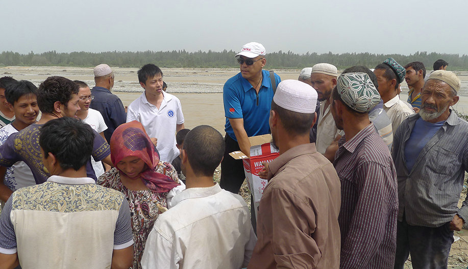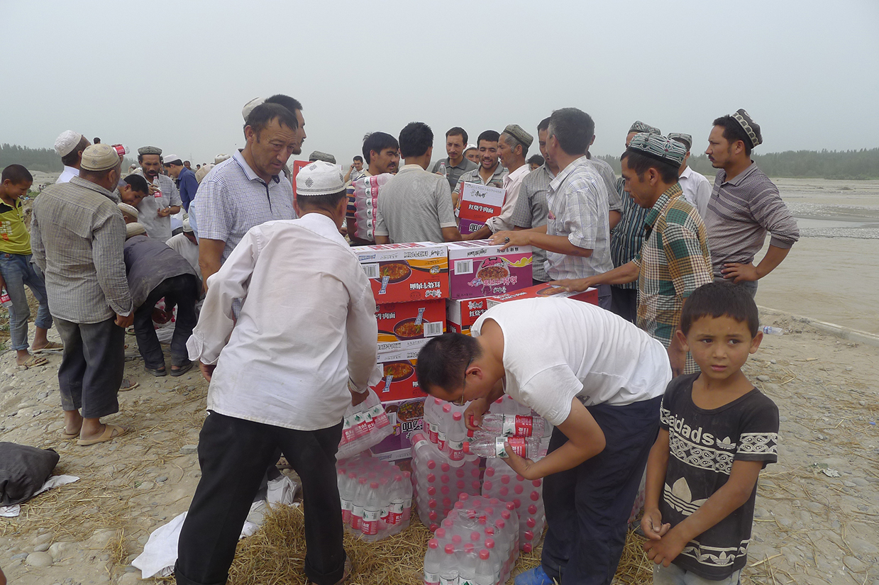 大汛当前,团结协作是夺取抗洪救灾全面胜利的根本保证。中科院新疆分院住村工作组临危不乱,周密部署,积极协调,工作组领导立即决定暂缓或终止正在开展的其他的工作,将整个工作组的工作重心放在了抗洪救灾上。在第一时间带领工作组成员亲临抗洪现场,了解防汛抗洪形势及受灾情况,慰问参与抗洪的群众。工作组领导走上大坝仔细查看坝体受损情况,了解抗洪措施和效果,询问参与抗洪群众的身体状况、休息、轮换情况,提醒村民注意自身安全。工作组领导还与在抗洪抢险一线进行指挥的乡政府领导讨论抗洪措施,分析了可能存在的险情。工作组的到来极大地鼓舞了群众的抗洪热情,大家干劲十足、斗志昂扬。同时,为解决参与抗洪群众的吃饭问题,工作组决定每天2次为参与抗洪的村民送去烤包子、纯净水、馕饼、方便面、西瓜等,充分保障了抗洪群众的基本生活需要。参与抗洪的群众纷纷表示,感谢工作组的关心,每天按时送饭和水,使大家解除了后顾之忧,对抗洪抢险取得胜利更加有信心。送去慰问品的同时,更加送去了派出单位领导们对于抗洪一线村民的关怀。