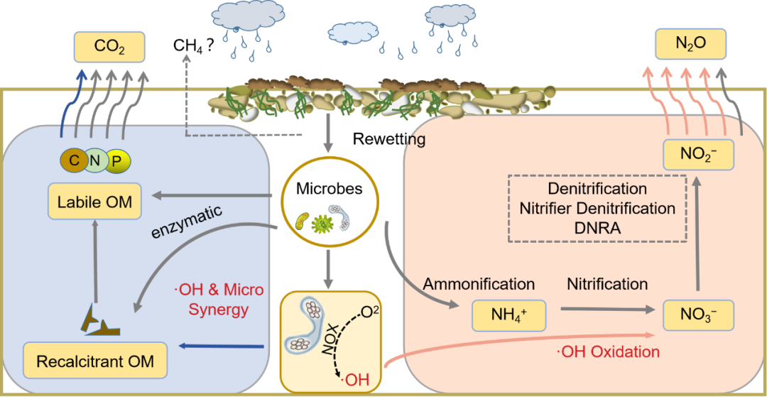 土壤再湿润后·OH加速温室气体产生的概念图