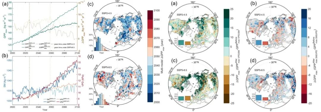 在全球气候变化背景下,植被活动与土壤水分之间的非线性反馈、阈值响应及空间异质性尚缺乏统一的认识,从而严重制约了对未来生态系统稳定性、生态风险及陆地碳汇功能潜力的精准预估。研究团队发展构建了近40年全球长时序植被—大气干燥度—土壤水分数据集,基于12种CMIP6全球气候模式数据和多源观测数据的对比分析,揭示了全球植被变绿与土壤水分散失的耦合作用机制。在过去40年,全球植被归一化植被指数(NDVI)上升速率为0.34×10-3/年,而土壤水分则以0.66×10-3~0.87×10-3 m-3 m-3/年的速率呈现下降趋势;未来持续变暖背景下,北半球最大总初级生产力增长速度(ΔGPPmax)将在2038±4.6年(SSP2-4.5)和2047±5.0年(SSP5-8.5)出现减缓趋势;全球约26.14%(SSP2-4.5)和34.11%(SSP5-8.5)的区域高估了水汽压差(VPD)对植被的影响作用,约58-64%的区域土壤水分对GPPmax的影响作用将会增强,全球植被变绿与土壤水分耦合作用增强,加大土壤干旱风险。研究成果发表在《Science Bulletin》《Communications Earth & Environment》期刊上,为国家“以水定绿”生态恢复实践及提升地球系统模式精度提供科技支撑。