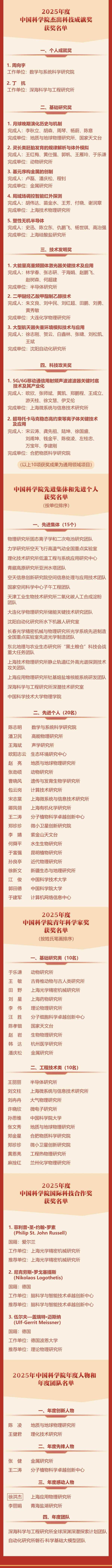 中国科学院青年科学家奖旨在表彰中国科学院科技创新活动中的先进典型和作出突出贡献的青年科技人才。中国科学院动物研究所于乐谦等10人获基础研究类奖项,中国科学院半导体研究所王丽丽等10人获工程技术类奖项。